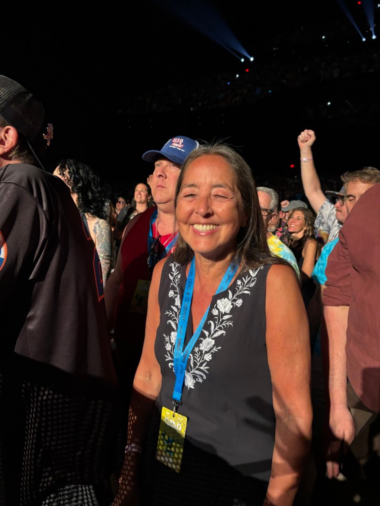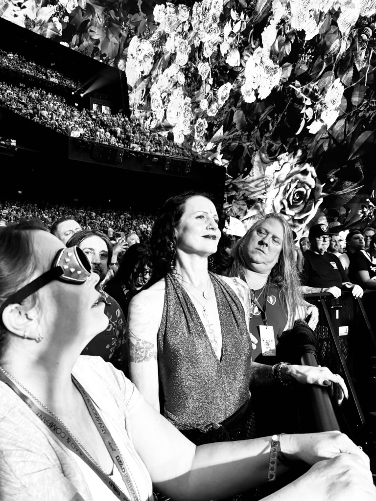 Early on, I encountered a few long timers who were abrasive at best and disturbingly unkind at worst. It wasn’t what I expected, and for a moment, I questioned whether I belonged. But being the strong, independent woman I am, I wasn’t about to let a few rough encounters deter me. With support from Lisa and my new friends, we embarked on a quiet mission. To create peace within the “Rail Riders” group—those dedicated fans who claim the front row, eager to be close to the music. Becoming accepted within this circle was challenging, and there were moments I felt like walking away. But slowly, small breakthroughs happened: shared smiles, moments of understanding, gestures that built fragile bridges.
